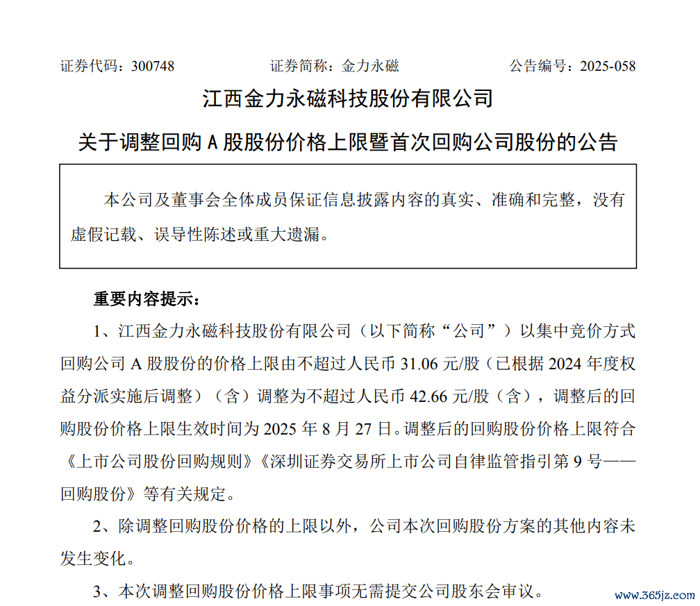 8月26日晚,稀土永磁龙头金力永磁公告称,公司已于8月25日初次回购了部分公司A股股份,同期公司拟将回购股份价钱上限由不高出31.06元/股(含)转机为不高出42.66元/股(含),上调幅度达37.35%。