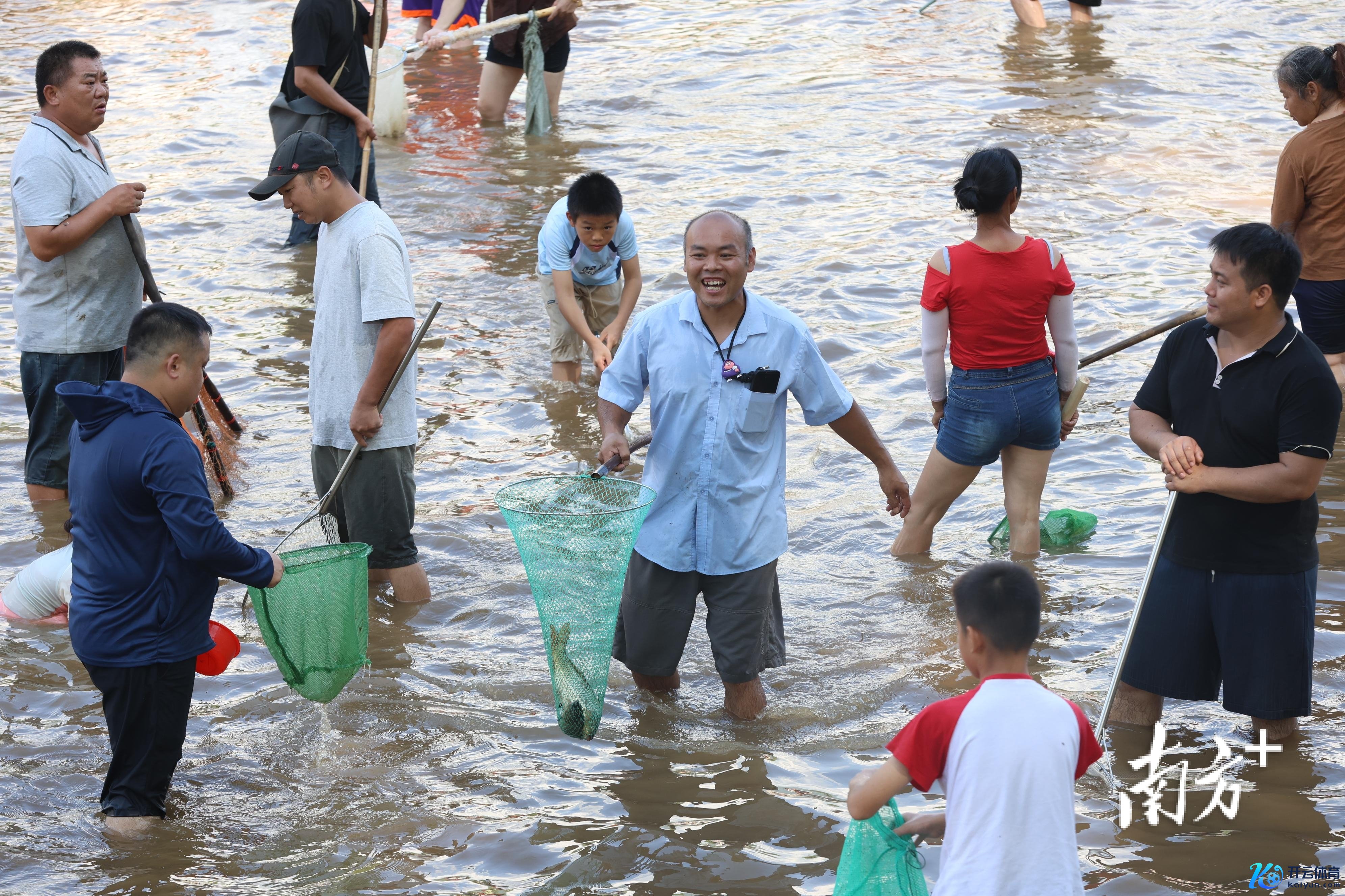 行径本日,连南县城三江河两岸,排满了准备下河“渔乐”的旅客与腹地全球。随着主理东说念主的一声“运行”,泛泛宁静的三江河滨,转瞬化作一派甘愿的海洋。来自宇宙各地的旅客、当地村民和亲子家庭纷纷卷起裤腿,手持种种渔具踏入精炼河水,张开一场意念念横生的执鱼追赶战。
